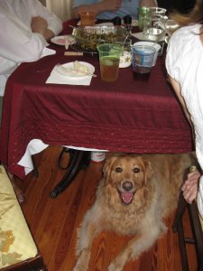 That is the life! Lying under a table, eating dropped snacks, getting foot rubs…
