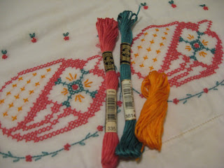 I ordered this set of antique pillowcases from ebay. One was completed, the other barely started. The finished case is much whiter than the unfinished one, but I had no way of knowing if the unfinished case would wash up after it was stitched. It didn’t. Actually, it is a bit better, but not much. I don’t think I’ll ever do this again. The fabric is far better than anything I could buy today in a kit, but the whole time I was working this pillowcase, I kept thinking, I don’t know where this has been, who handled it over the past several decades. And of course, you can’t wash it before you finish stitching because the stamped pattern is water soluble. It made me want to wash my hands repeatedly.