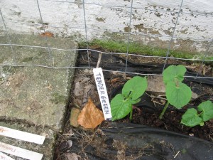 Those are volunteer marigolds or possibly cosmos growing behind the fence. Not sure how they will do. Then the row of beans in front of the fence, and nasturtium seeds were planted in the 4 circles in front of the beans. Volunteer cosmos to the left, at the end of this bed. Good to prevent soil erosion, bad because it may overshadow the beans on that end.