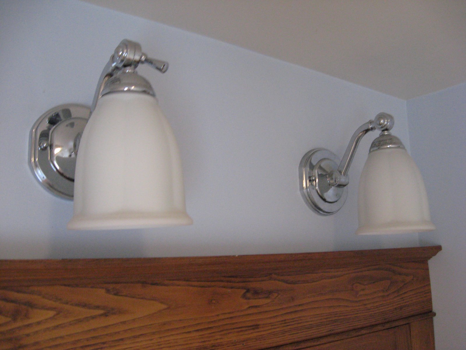 The light fixtures, with adjustable angles, and shades that mimic the bell-shape on the faucet.